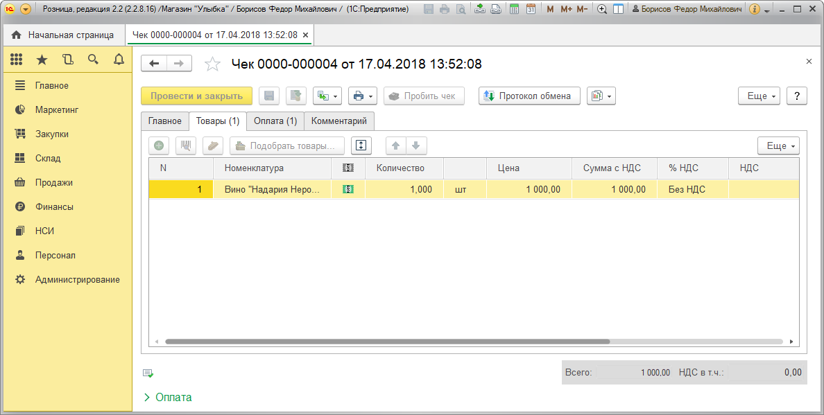 После пробития чека система автоматически создаст документ Чек (раздел Продажи – Розничные продажи – Чеки).