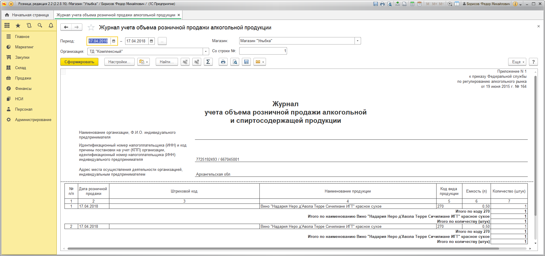 Отчет "Журнал учета объема розничной продажи алкогольной и спиртосодержащей продукции", утвержденный приказом ФСРАР от 19.06.2015 г. № 164, находится в разделе Продажи – Отчеты по продажам – Розничные продажи и называется Журнал учета объема розничной продажи алкогольной продукции. Он позволяет проанализировать сведения о продажах, отправленные в ЕГАИС.