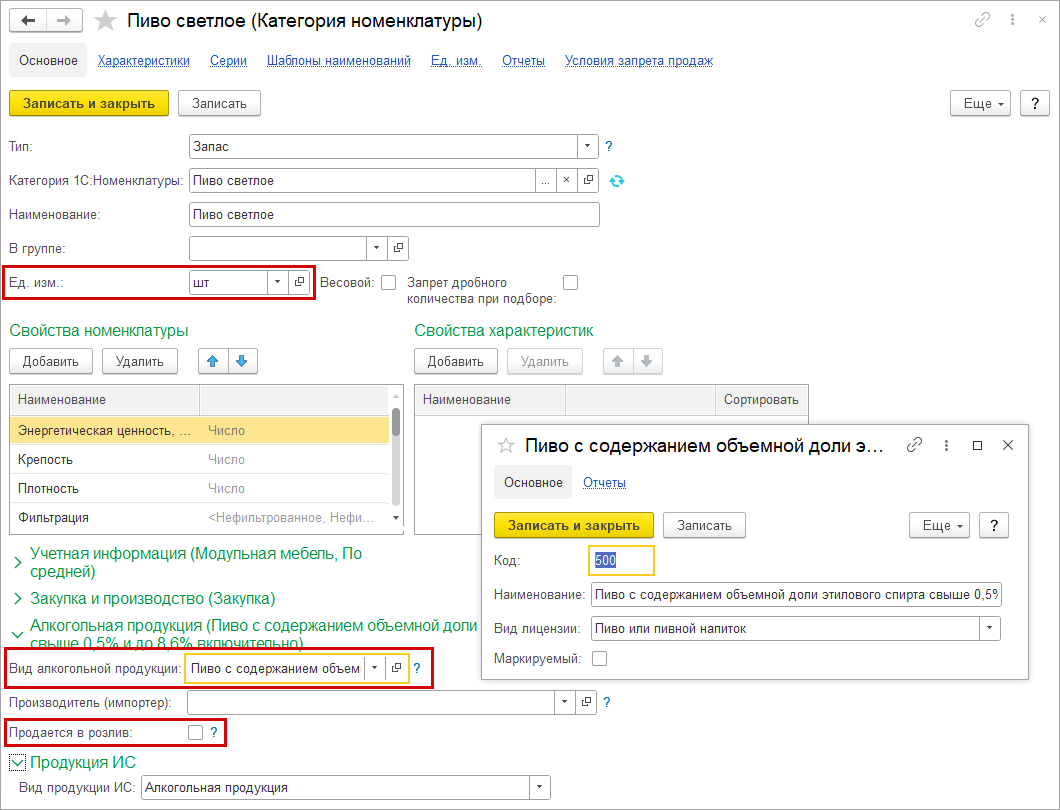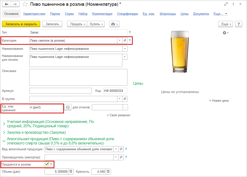 - в группе "Алкогольная продукция" установите флажок "Продается в розлив".