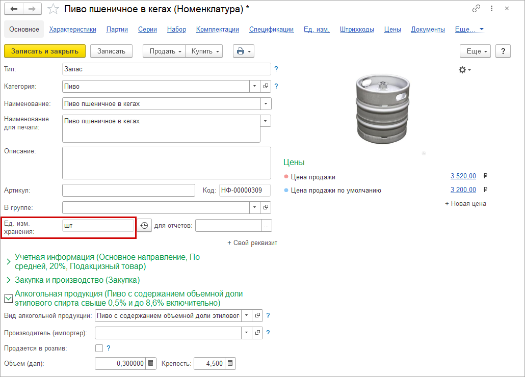 - единицу хранения остатков, соответствующую продукции в кегах.