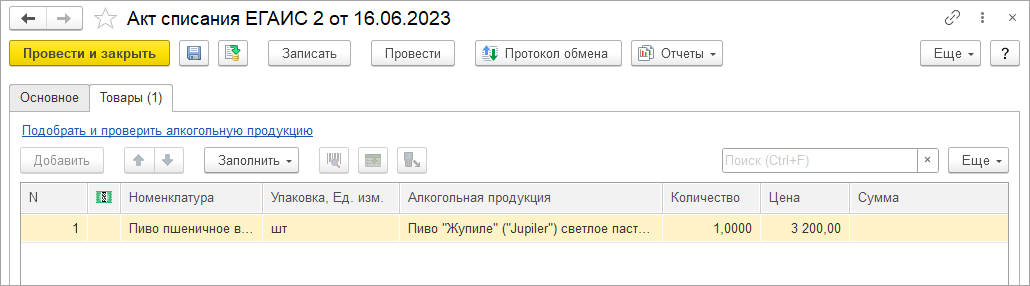 В поле "Номенклатура" укажите продукцию в закрытой таре, а в табличной части "Товары" – разливную продукцию.