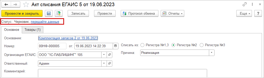 Проведите документ, в подвале документа появится команда "Создать акт списания ЕГАИС". Она позволит передать в ЕГАИС сведения о факте вскрытия тары.