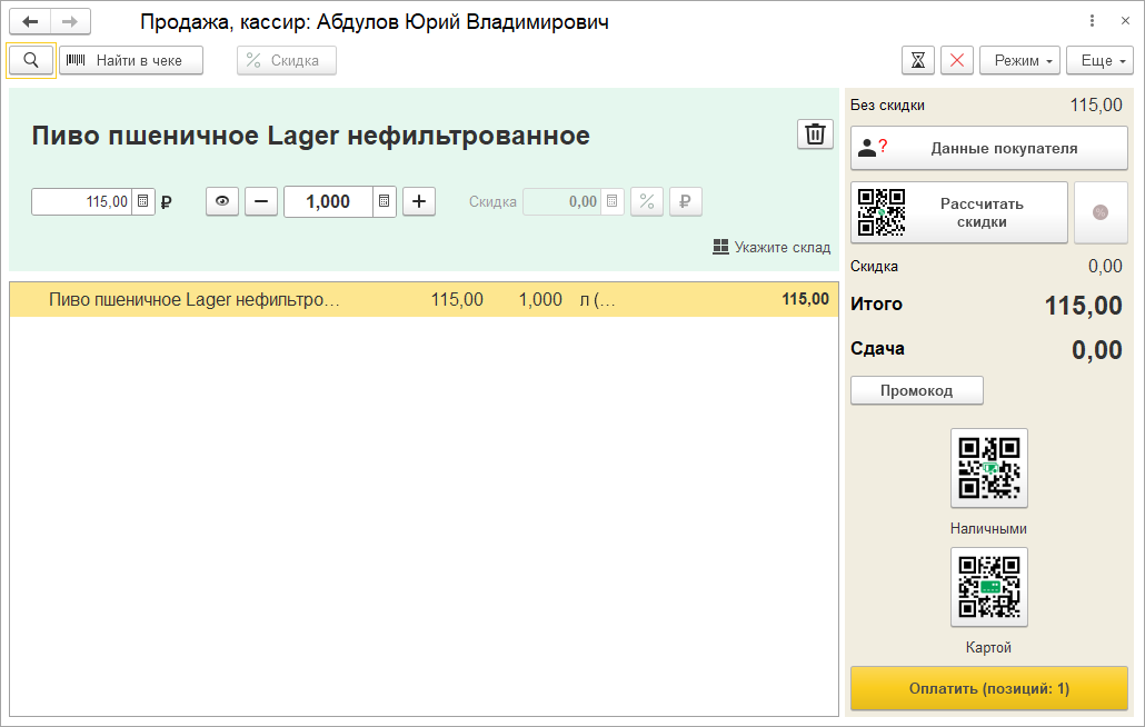 Создайте документ из раздела Продажи – Розничные продажи – Чеки