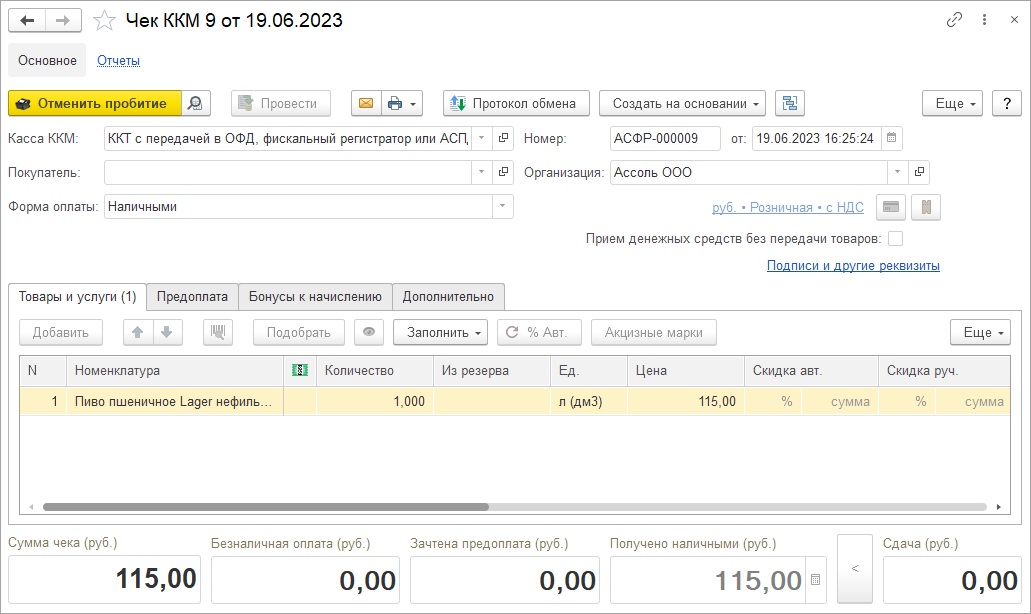 | 2 | Реализация розничному покупателю | Чек ККМ | Разливная | "-" | Чек ККМ |