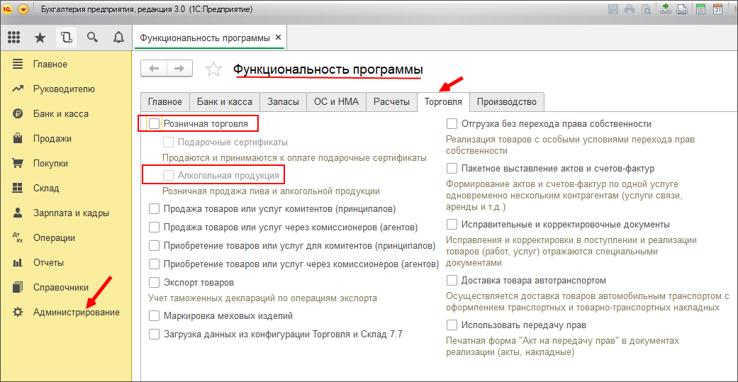 Для работы с алкогольной продукцией (в том числе и для взаимодействия в ЕГАИС) в разделе Администрирование - Функциональность программы на закладке Торговля должны быть включены опции (Рис. 1):
