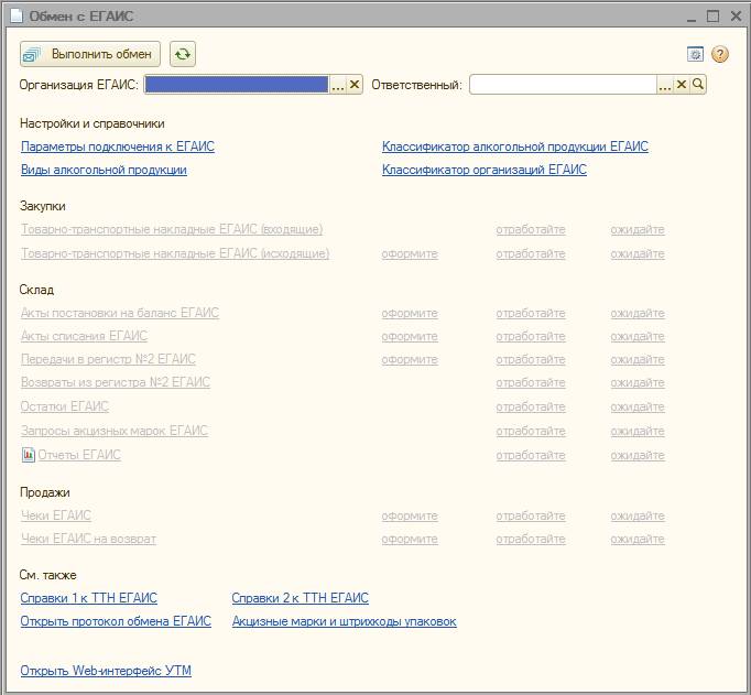 Форма Обмен с ЕГАИС является единым рабочим местом, из которого можно выполнять настройки обмена с ЕГАИС, оформлять и контролировать все операции с алкогольной продукцией, требующей отражения в ЕГАИС. Форму можно открыть из главного меню в интерфейсе «Управление розничной торговлей».