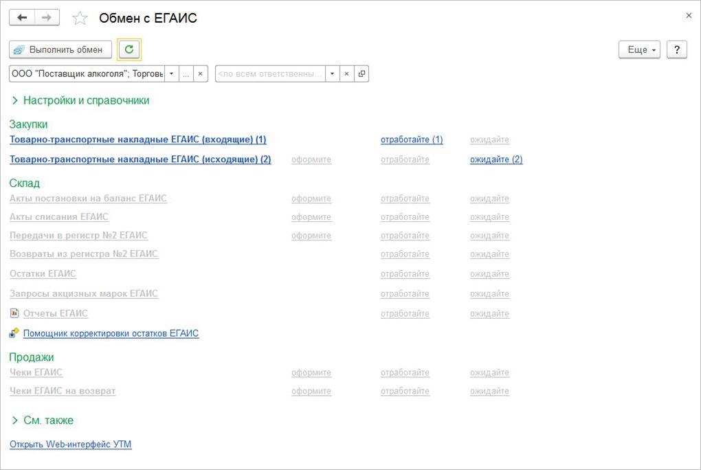 - отработайте – в скобках указано количество документов, по которым получен ответ от ЕГАИС и требуется выполнение каких-либо действий (например, оформления документов информационной базы);