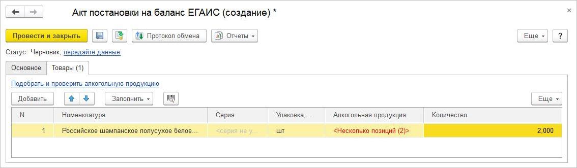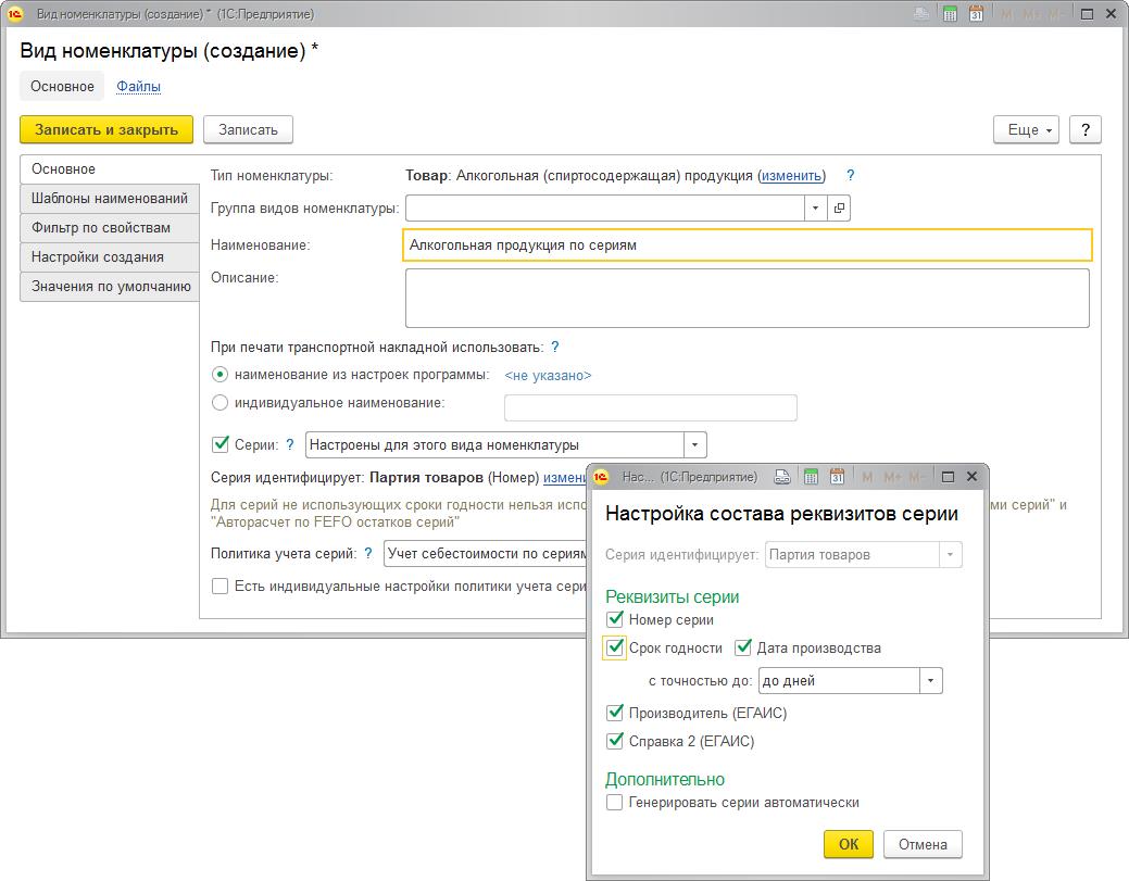 Для алкогольной продукции может быть организован учет по сериям. Серия для алкогольной продукции всегда идентифицирует партию товаров, а в состав реквизитов серии наряду с прочими могут быть Производитель (ЕГАИС) и Справка 2 (ЕГАИС).