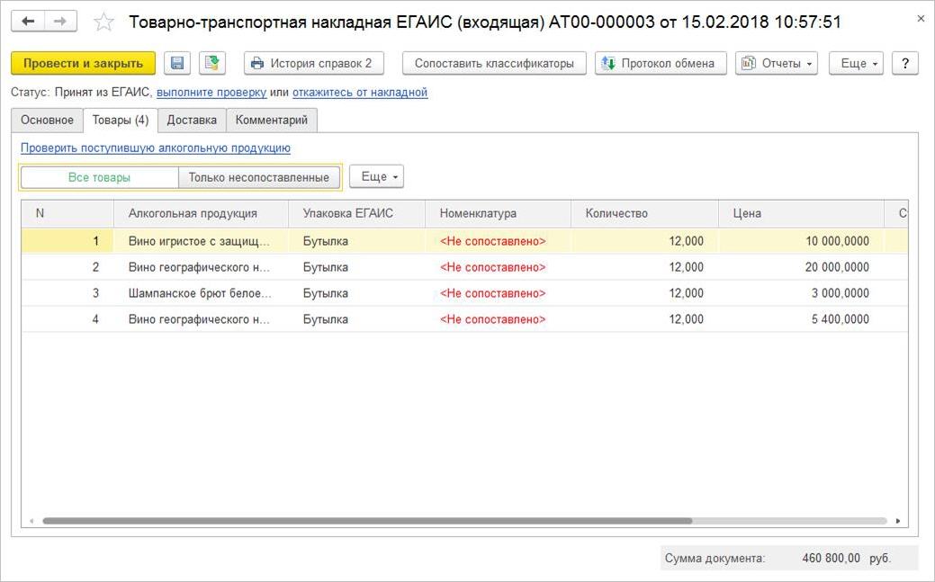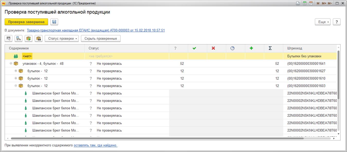 При поступлении алкогольной продукции в маркированной упаковке от поставщика сведения об упаковке будут указаны в документе ТТН ЕГАИС (входящая). Состав и штрихкоды упаковок можно посмотреть в форме Проверка поступившей алкогольной продукции.