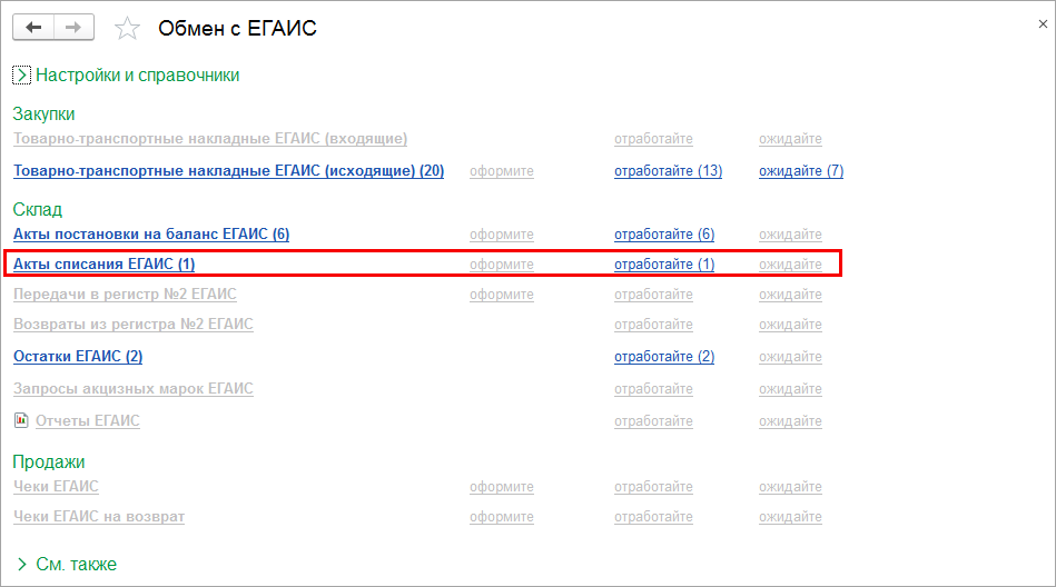 Примечание: документ Акт списания ЕГАИС не делает движений по складу в "1С:Управление нашей фирмой".