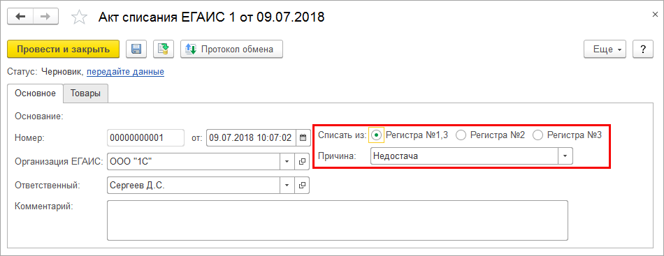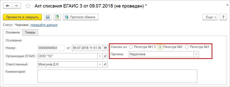 Списание продукции с баланса в ЕГАИС в Регистре № 2 происходит аналогично, но с небольшим исключением. В созданном документе на закладке Основное переключатель Списать из нужно установить в значение Регистр № 2.