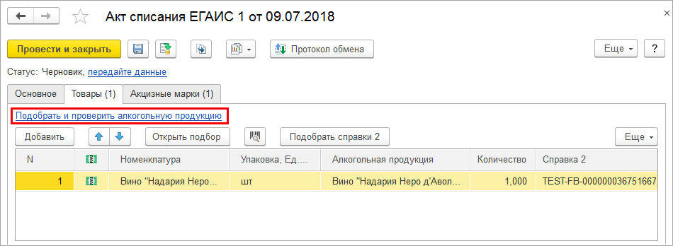 Если продукция маркируемая, то следует с помощью команды Подобрать и проверить алкогольную продукцию считать сканером штрихкоды списываемых упаковок и акцизных марок.