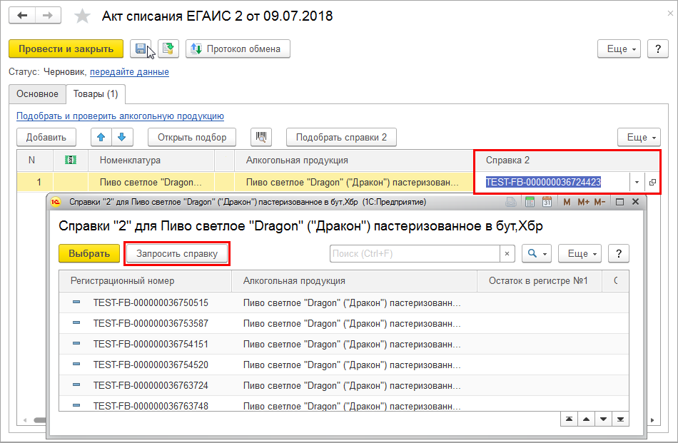 - Справка 2 – указывается справка, соответствующая списываемой партии. Если Cправка 2 не загружена, ее можно запросить по номеру (по кнопке Запросить справку в форме подбора справки).