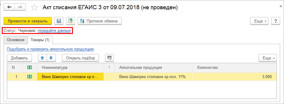 Проведите документ, ему будет присвоен статус Черновик, передайте данные.