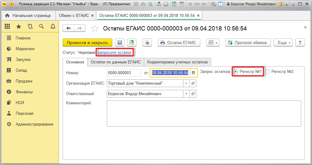 Для того чтобы получить остатки по Регистру № 1 ЕГАИС, необходимо: