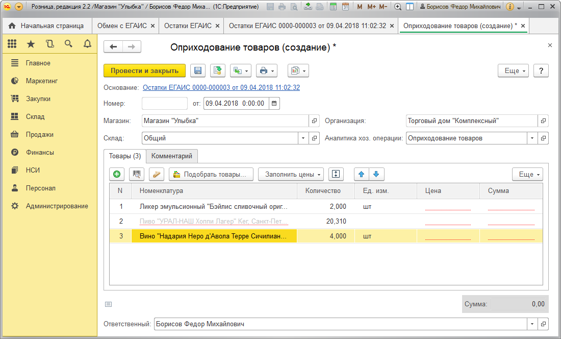 Откроется форма документа Оприходование товаров, заполненная всей алкогольной продукцией из документа-основания Остатки ЕГАИС.