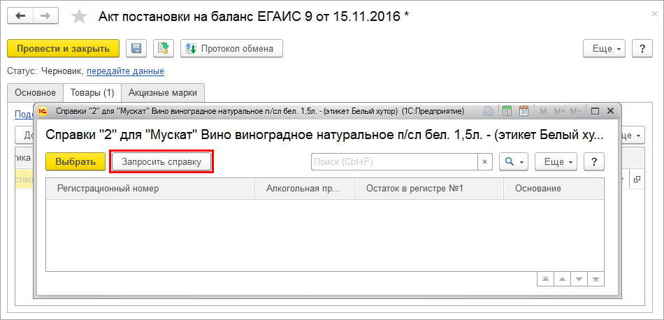 Различие в том, что при запросе остатков по Регистру № 2 в форме документа Остатки ЕГАИС на закладке Основное следует установить переключатель Запрос остатков в режим Регистр № 2.