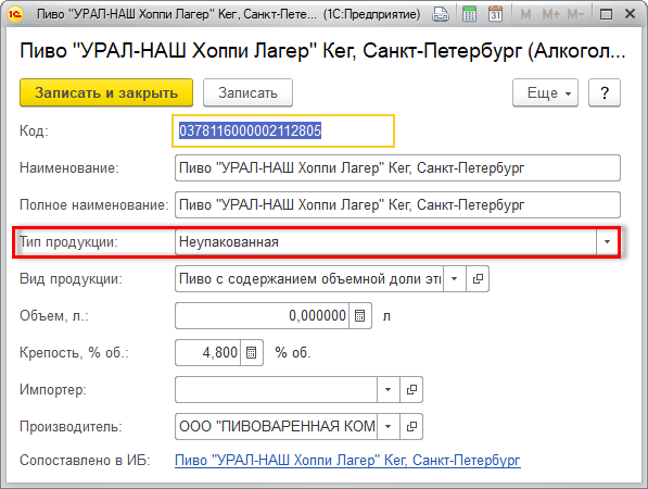 Тип продукции в ЕГАИС – Упакованная или Неупакованная – определяет поставщик при отправке сведений. В "1С:УНФ" его можно посмотреть в соответствующем элементе справочника Классификатор алкогольной продукции.
