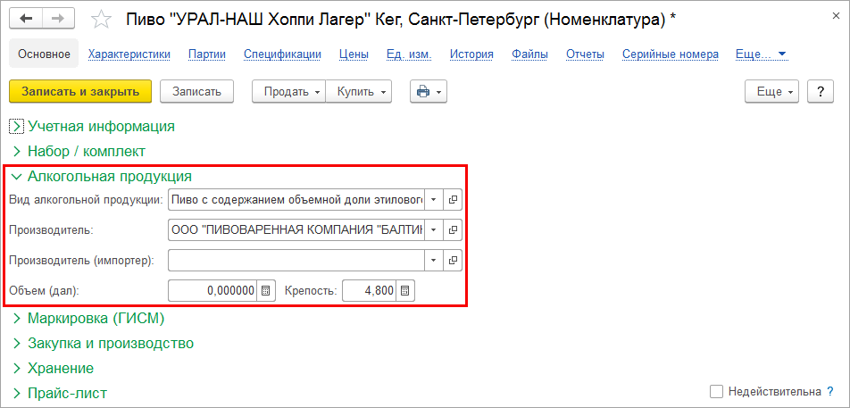 Объем единицы продукции или транспортной упаковки разливной продукции в декалитрах устанавливается в элементе справочника Номенклатура.