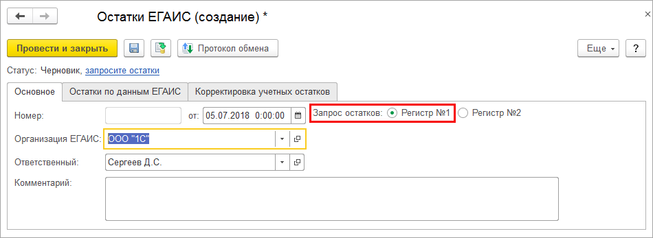 Закладка Корректировка учетных остатков в этом случае будет недоступна. Документ (аналогично запросу по Регистру № 1) отправляется в ЕГАИС.