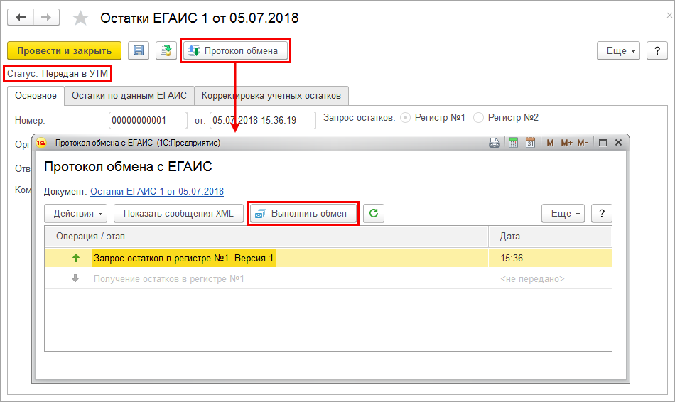 В ЕГАИС будет направлен запрос на получение остатков. Статус документа изменится на Передан в УТМ.