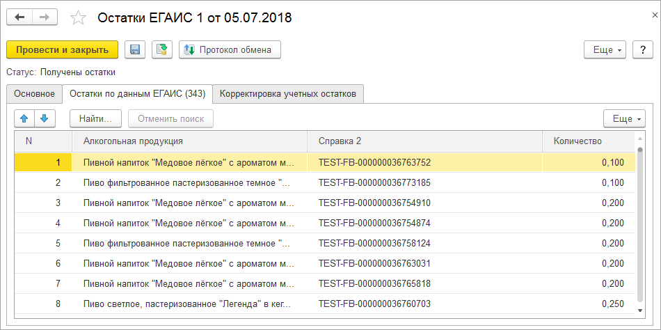 После получения ответа из ЕГАИС статус документа автоматически изменится на Получены остатки и на закладке Остатки по данным ЕГАИС будет загружена полученная информация.