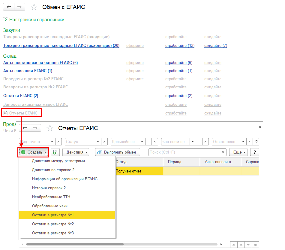 Для того чтобы получить остатки по Регистру № 1 ЕГАИС, необходимо использовать документ Остатки ЕГАИС.