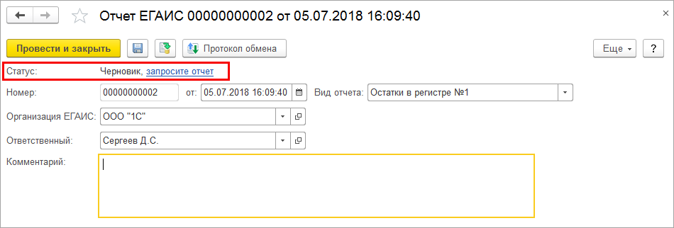 После получения ответа из ЕГАИС статус документа автоматически изменится на Получен отчет.