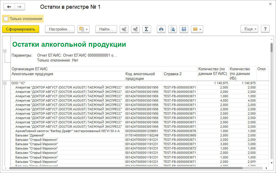 Проверить наличие расхождений в остатках алкогольной продукции по данным ЕГАИС и нашей базы помогут отчеты Остатки в Регистрах № 1, 2, 3.