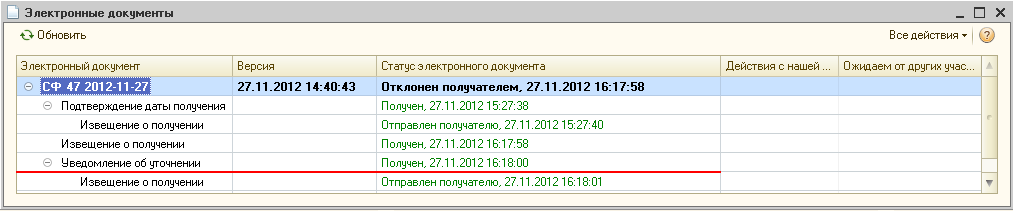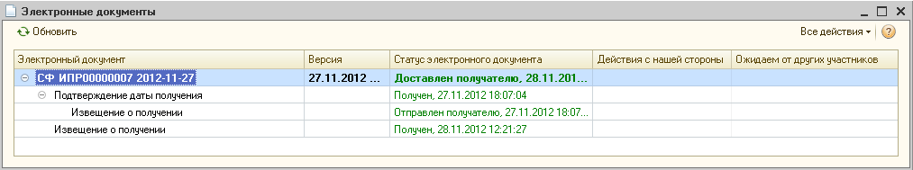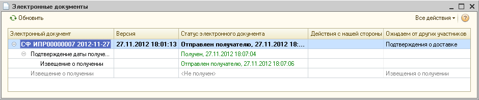 Для просмотра содержимого каждого электронного документа (исправленного счета-фактуры, подтверждения, извещений и т.д.) с описанием прохождения всех необходимых статусов обмена, необходимо дважды щелкнуть по активной строке в форме списка (рис. 12).