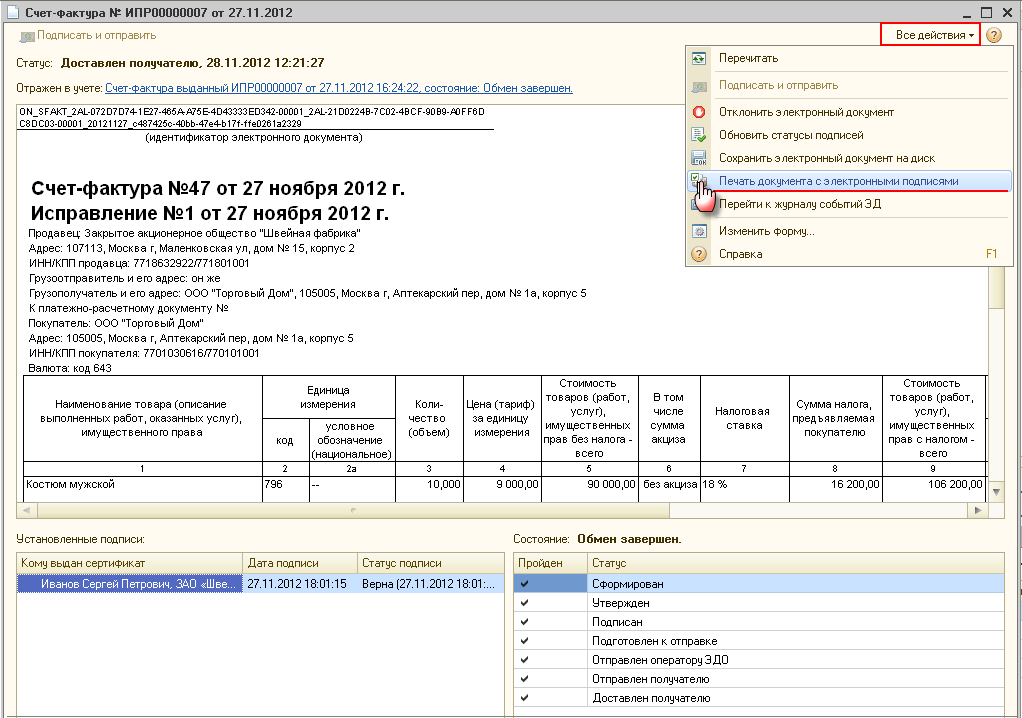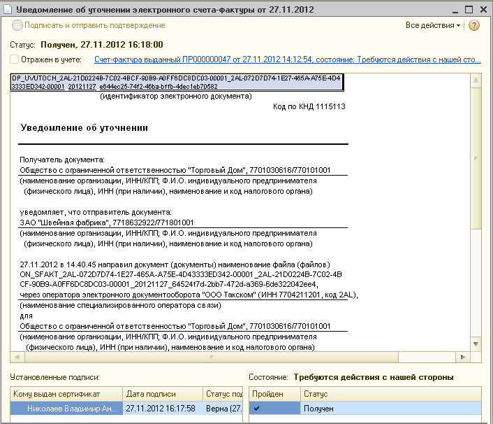 Полученное уведомление отражается у продавца в "Архиве электронных документов" (Сервис - Обмен электронными документами - Архив электронных документов основного меню программы), а также в форме Электронные документы (Таблице состояния), открываемой по гиперссылке "Состояние ЭД" или по команде ЭД - Список электронных документов из документа учетной системы "Счет-фактура выданный" (рис. 1).