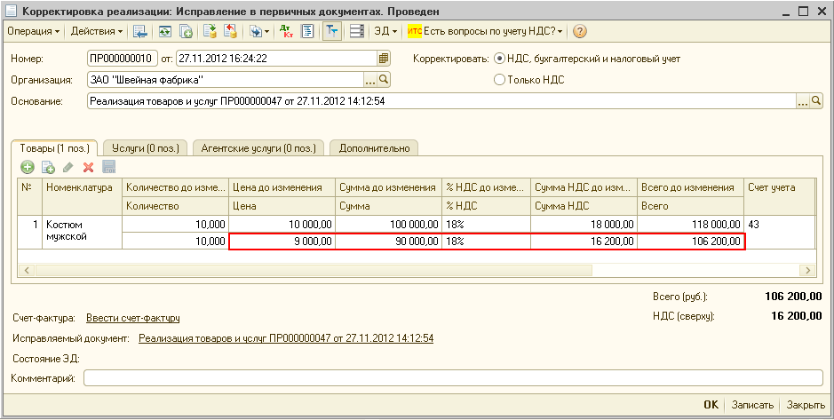 - Сформировать на основании документа "Корректировка реализации" документ учетной системы "Счет-фактура выданный", щелкнув по ссылке Ввести счет-фактуру в окне документа.