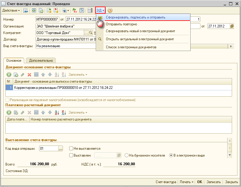 - Сформировать исправленный счет-фактуру в электронной форме, выбрав команду ЭД -Сформировать, подписать и отправить (рис. 4).