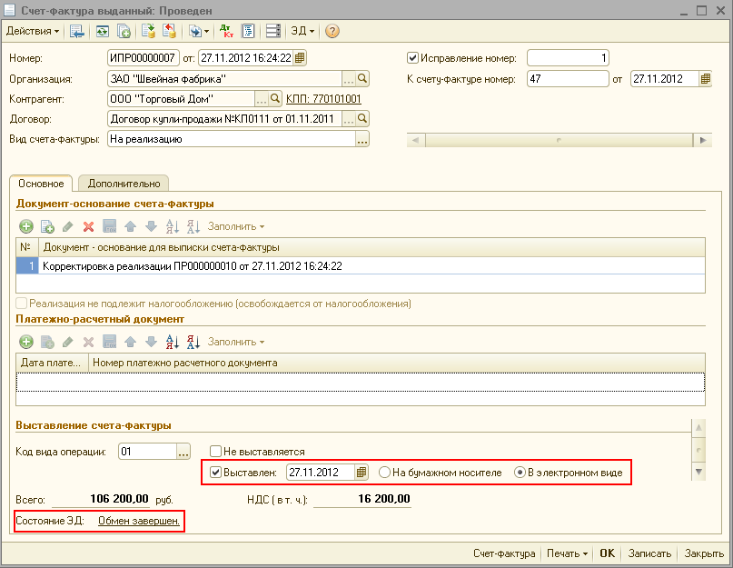 В документе "Счет-фактура выданный" в поле "Состояние ЭД" появится статус Обмен завершен и в поле "Выставлен" - флажок и дата выставления (рис. 11).