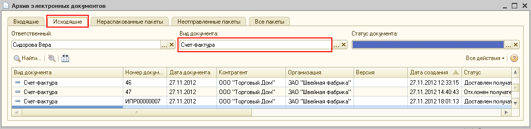 На закладке "Исходящие" списка "Архив электронных документов" можно отсортировать документы или отобрать отправленные документы по ответственному лицу, виду и статусу документа (рис. 14).