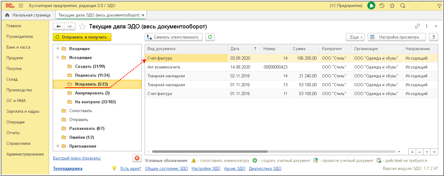 Полученное уведомление об уточнении отражается в папке "Исправить" списка входящих документов формы "Текущие дела ЭДО" (рис. 1).