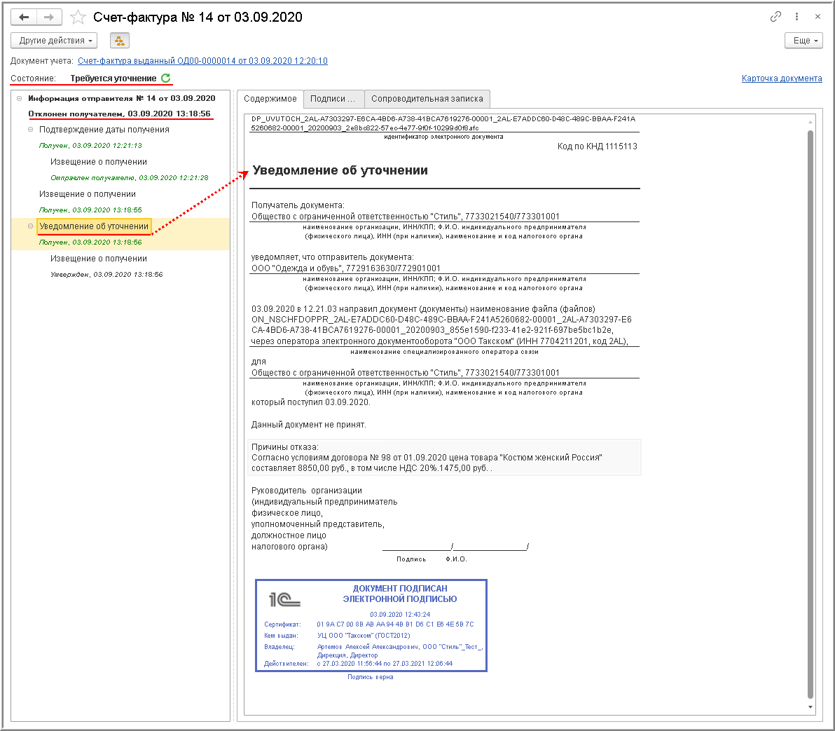 В форме просмотра выставленного покупателю электронного счета-фактуры будет отражена информация о том, что отправленный электронный счет-фактура отклонен получателем, а также о том, что требуется его уточнение (строка "Состояние:").