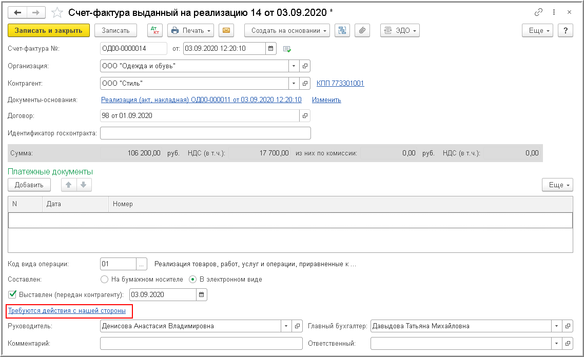 - в строке, отражающей текущее состояние процесса обмена исправленным электронным счетом-фактурой, будет присутствовать гиперссылка Требуются действия с нашей стороны.