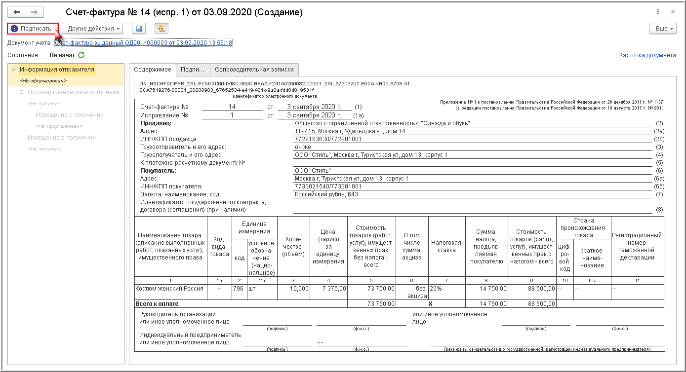 В форме просмотра в строке "Состояние:" будет отражена информация о том, что обмен электронным счетом-фактурой не начат (Не начат).