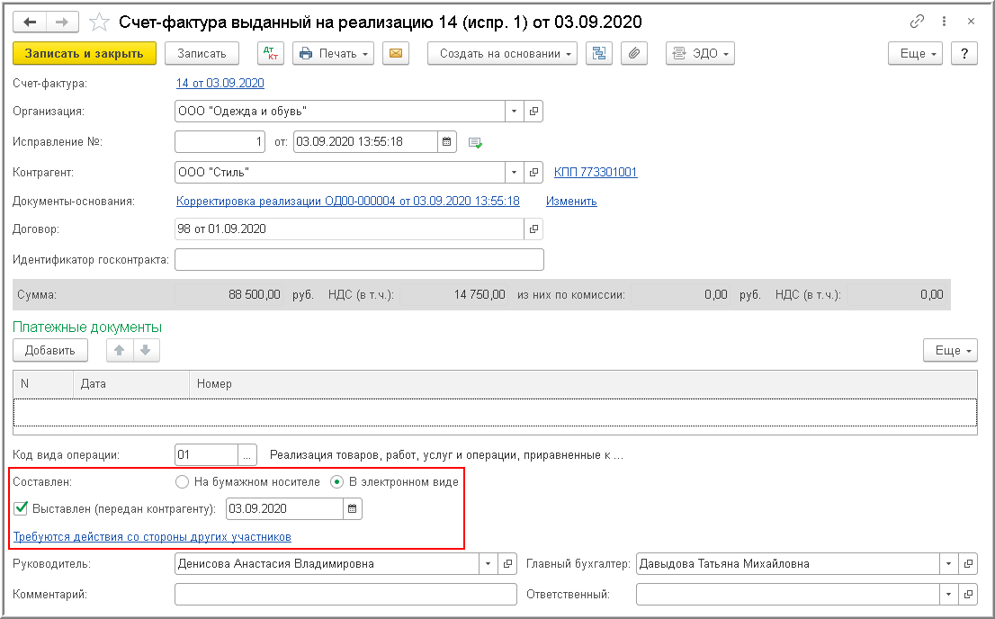 Обмен исправленным электронным счетом-фактурой производится в порядке, аналогичном обмену электронным счетом-фактурой до внесения в него исправлений. Подробнее см. Выставление электронного счета-фактуры в "1С:Бухгалтерии 8"