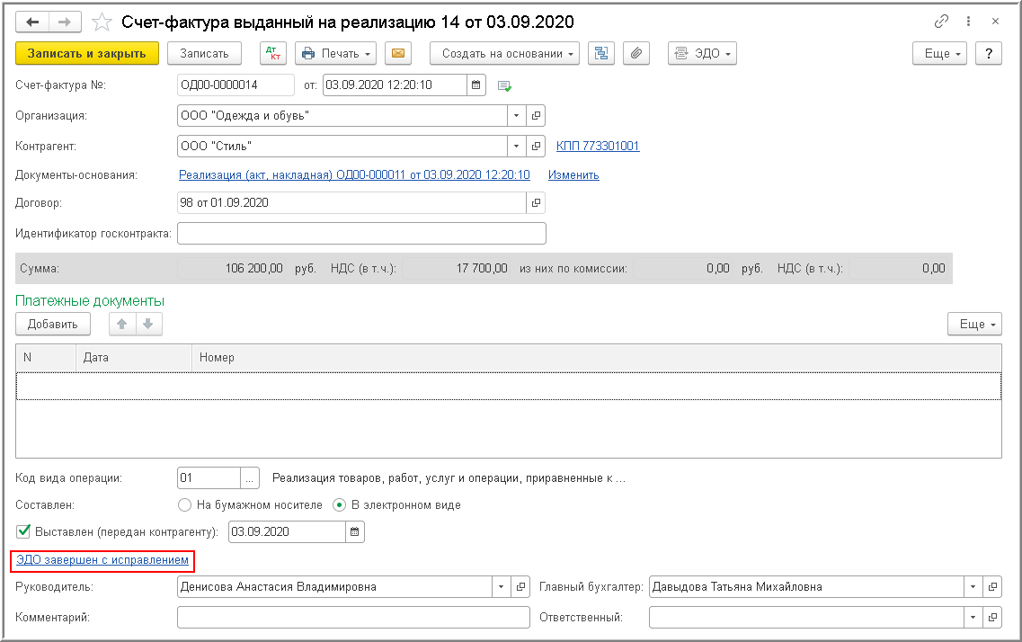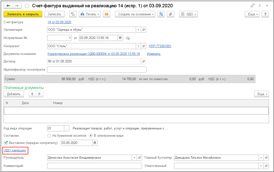 В документе учетной системы "Счет-фактура выданный" в информационной строке состояния обмена исправленным электронным счетом-фактурой отразится статус ЭДО завершен (рис. 12).
