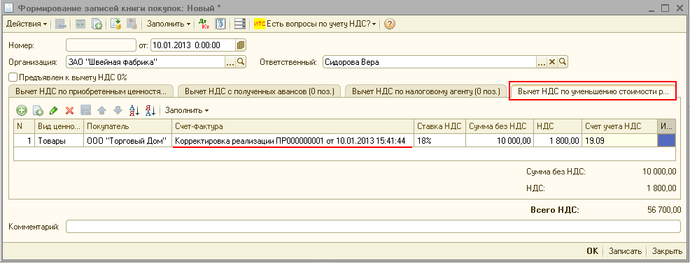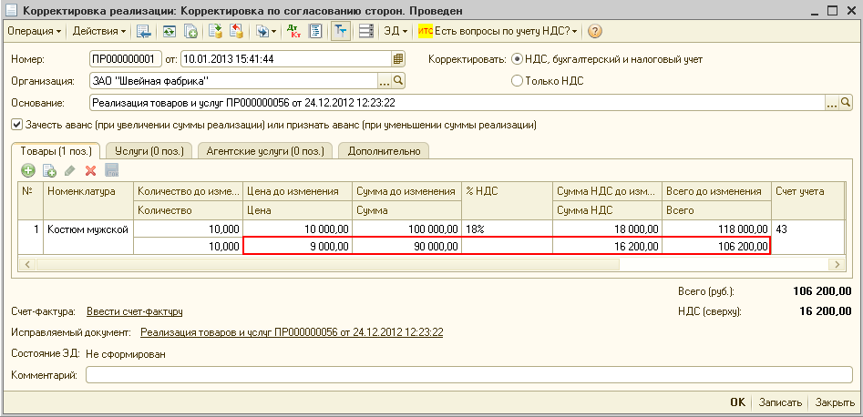 Напомним, что при увеличении стоимости начисление налога и запись в книге продаж производятся автоматически после проведения документа "Корректировка реализации" с видом операции "Корректировка по согласованию сторон".
