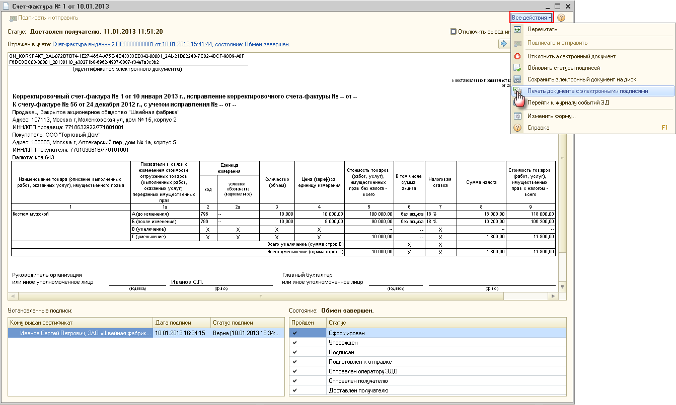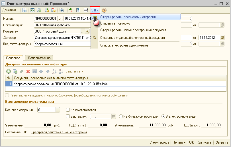 - Сформировать корректировочный счет-фактуру в электронной форме, выбрав команду ЭД -Сформировать, подписать и отправить (рис. 2).