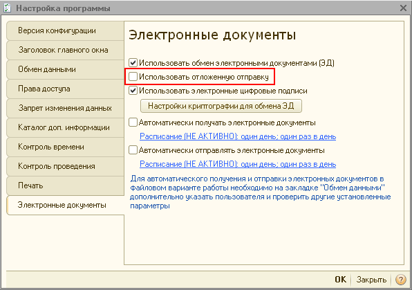 Если в настройке электронного обмена (рис. 3) (меню Операции - Константы - Настройка программы - Электронные документы) отсутствует флажок в поле "Использовать отложенную отправку", то сформированный и подписанный электронный документ будет незамедлительно автоматически направлен оператору ЭДО.
