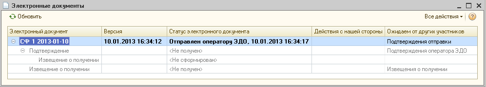После получения и обработки подтверждения оператора ЭДО в строке Состояние ЭД в документе "Счет-фактура выданный" и в форме Электронные документы (Таблице состояния) (рис. 6) будет содержаться информация об ожидании извещения о получении от покупателя.