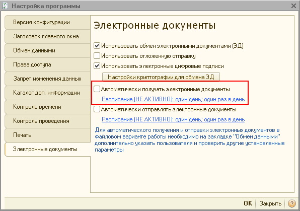 - автоматически, если проставлен флажок в поле "Автоматически получать электронные документы" и произведена соответствующая настройка расписания получения (меню Операции - Константы - Настройка программы - Электронные документы) (рис. 5).