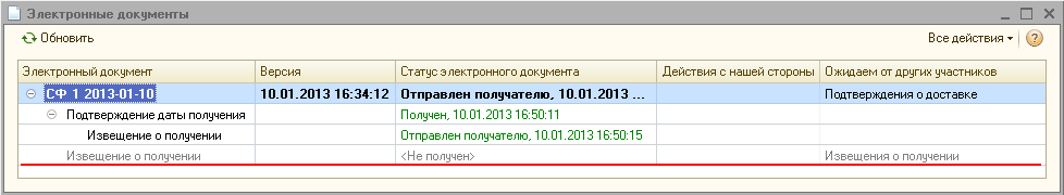 Всю информацию о состоянии и движении корректировочного электронного счета-фактуры можно увидеть в форме Электронные документы (Таблице состояния) (рис. 12), открываемой по команде формы документа ЭД - Список электронных документов или по гиперссылке "Состояние ЭД".