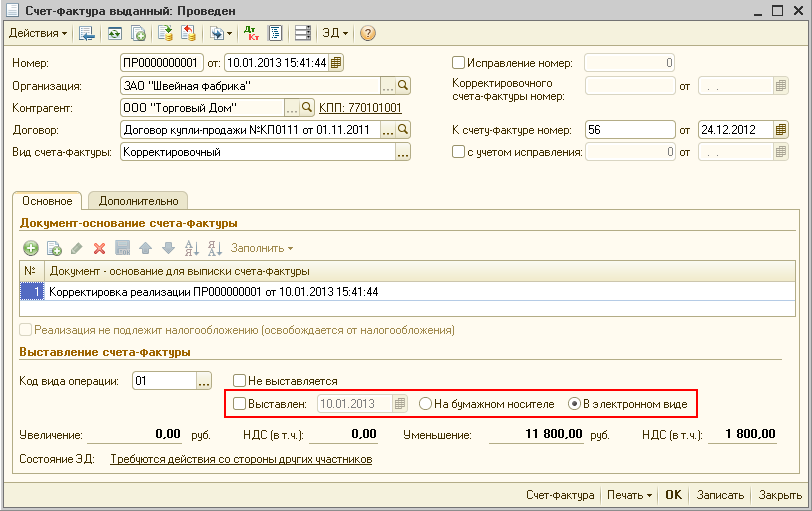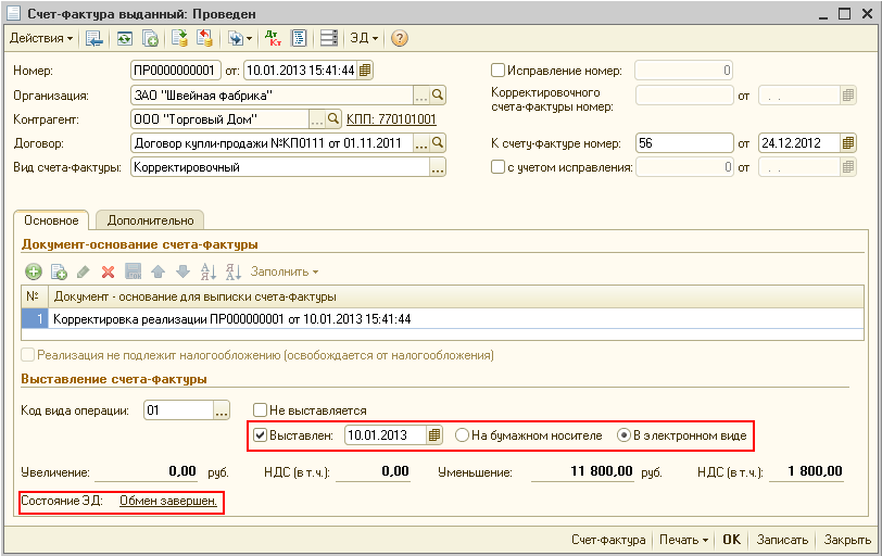 Поступление извещения от покупателя о получении корректировочного счета-фактуры в электронной форме завершит процедуру обмена. В документе "Счет-фактура выданный" в поле "Состояние ЭД" появится статус Обмен завершен и в поле "Выставлен" - флажок и дата выставления (рис. 11).