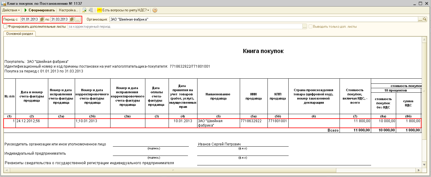 После проведения документа "Формирование записей книги покупок" электронный корректировочный счет-фактура будет зарегистрирован в книге покупок налогового периода корректировки стоимости и выставления корректировочного счета-фактуры (рис. 10).
