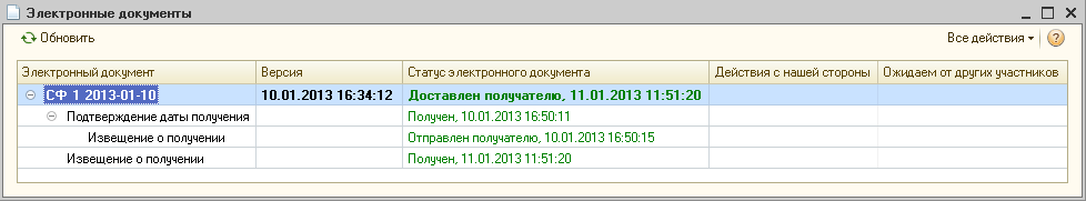 Для просмотра содержимого каждого электронного документа (корректировочного счета-фактуры, подтверждения, извещений и т.д.) с описанием прохождения всех необходимых статусов обмена необходимо дважды щелкнуть по активной строке в форме списка (рис. 12).